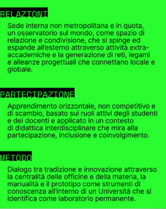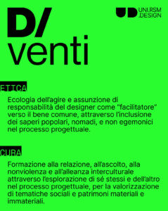 I principi e valori fondanti su cui si vuole costruire il Manifesto di UNIRSM Design sono: etica, cura, relazioni, partecipazione e metodo.