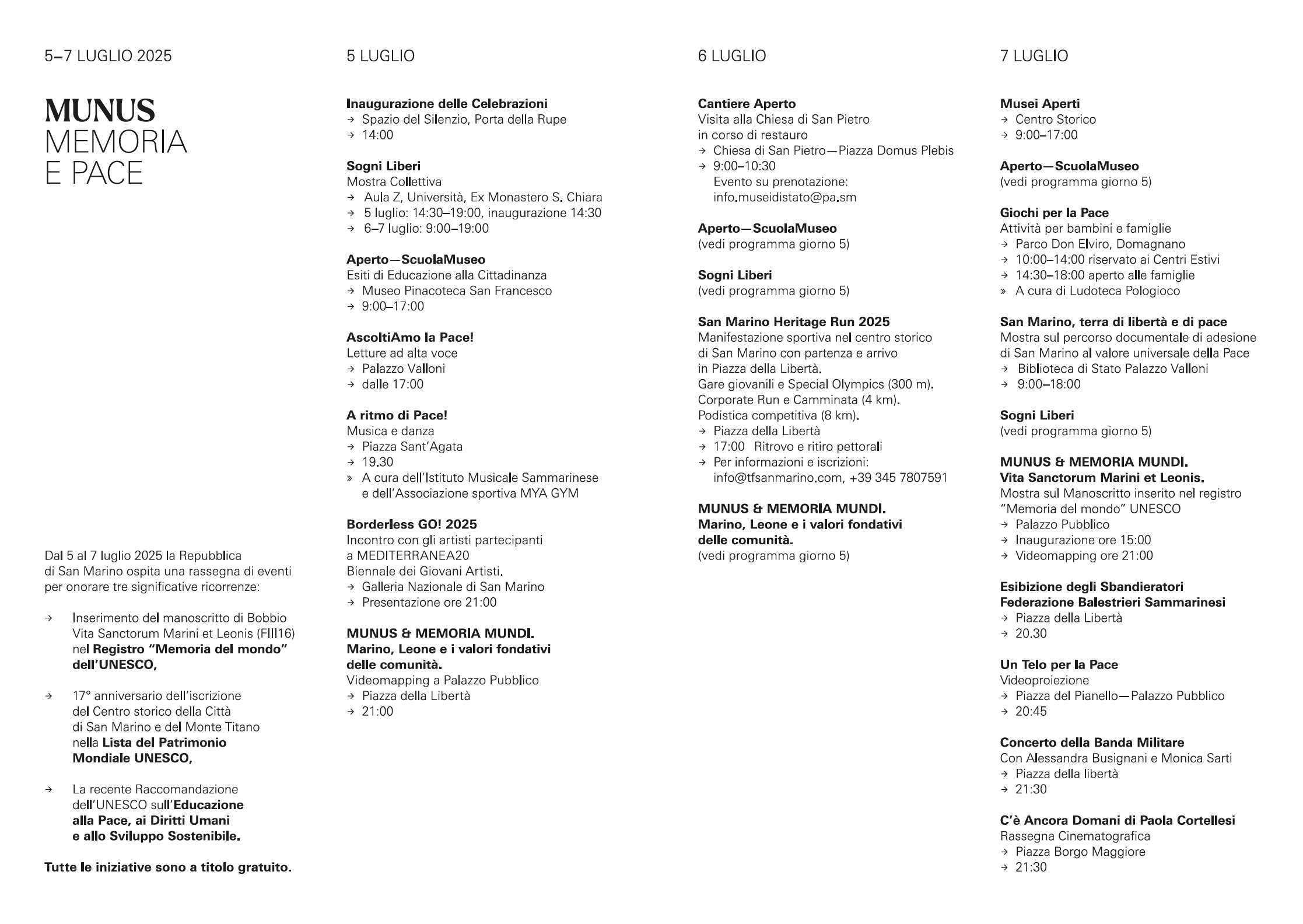 Dal 5 al 7 luglio, la Repubblica di San Marino si trasforma in un grande palcoscenico per “MUNUS – Memoria e Pace”. Tra le mura antiche del suo famoso Centro Storico, San Marino celebrerà il 17° anniversario dell’iscrizione delle sue bellezze nella Lista del Patrimonio UNESCO e i 50 anni di adesione all’Organizzazione. Tre giorni all’insegna di Memoria, Patrimonio e Pace, con proiezioni immersive sul Palazzo Pubblico, mostre d’eccezione e momenti di riflessione nel cuore della città millenaria.