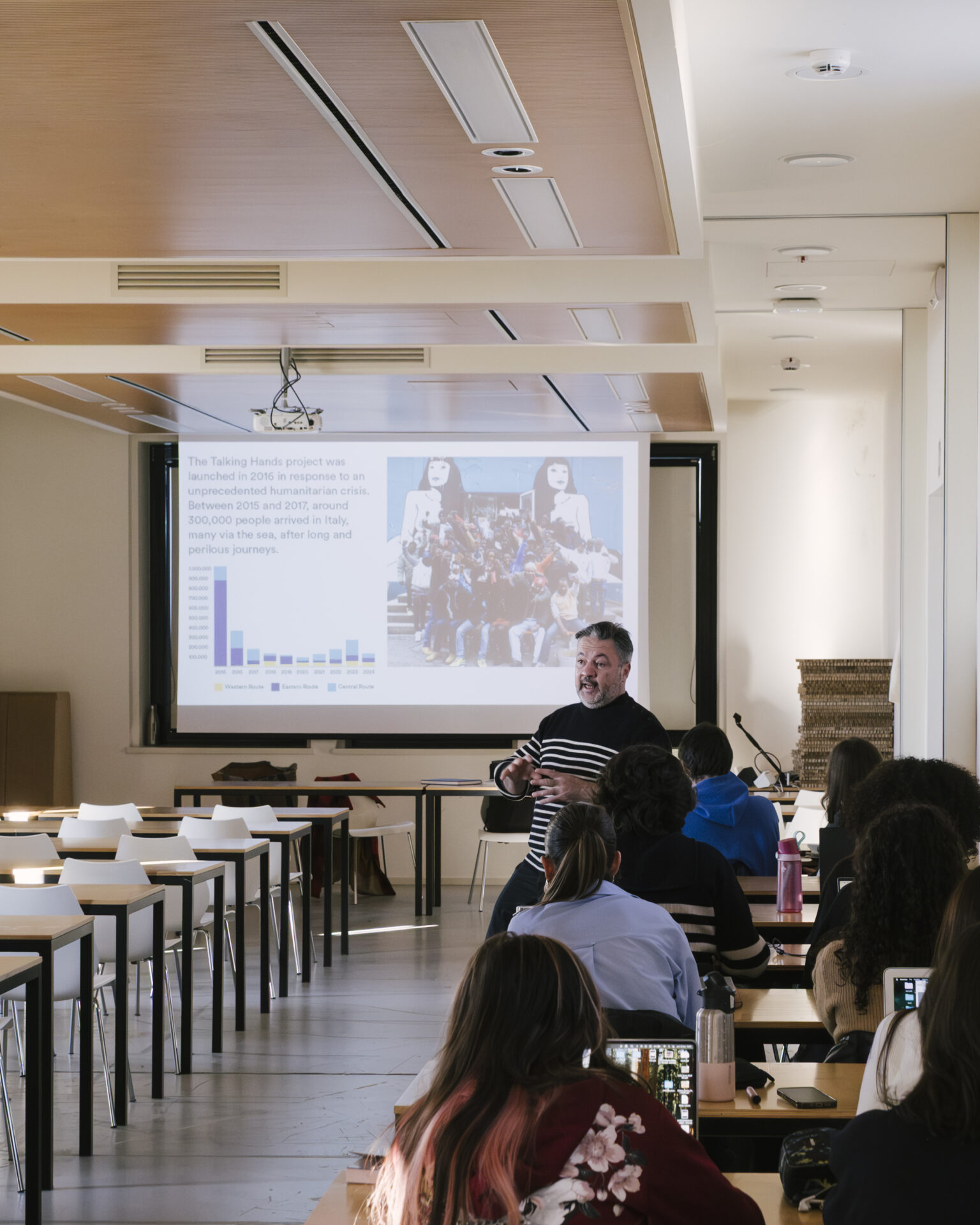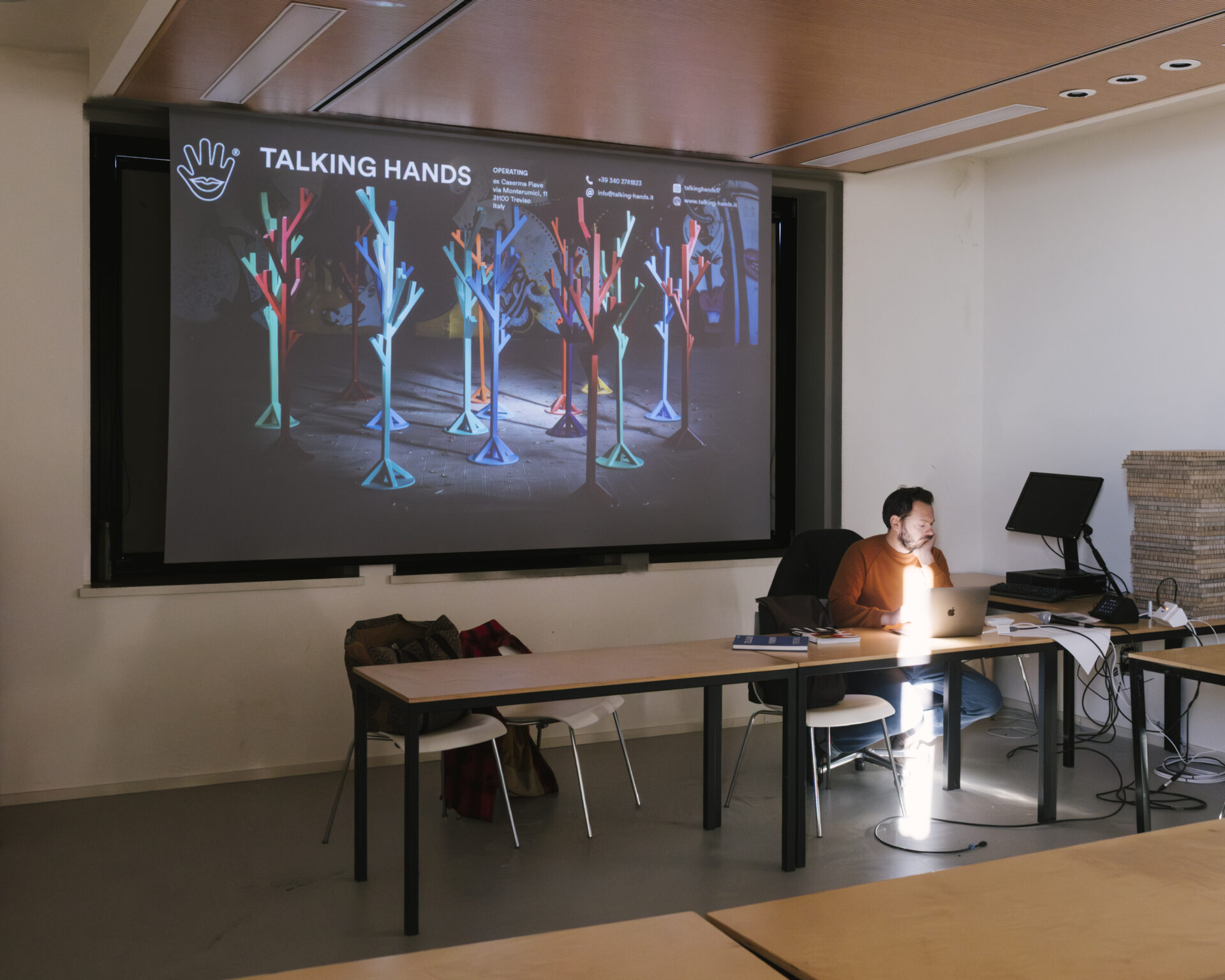 L’intervento presenta Talking Hands, laboratorio permanente di design e innovazione sociale attivo dal 2016 a Treviso, nato in risposta alla crisi umanitaria che ha portato migliaia di rifugiati e richiedenti asilo in Italia.