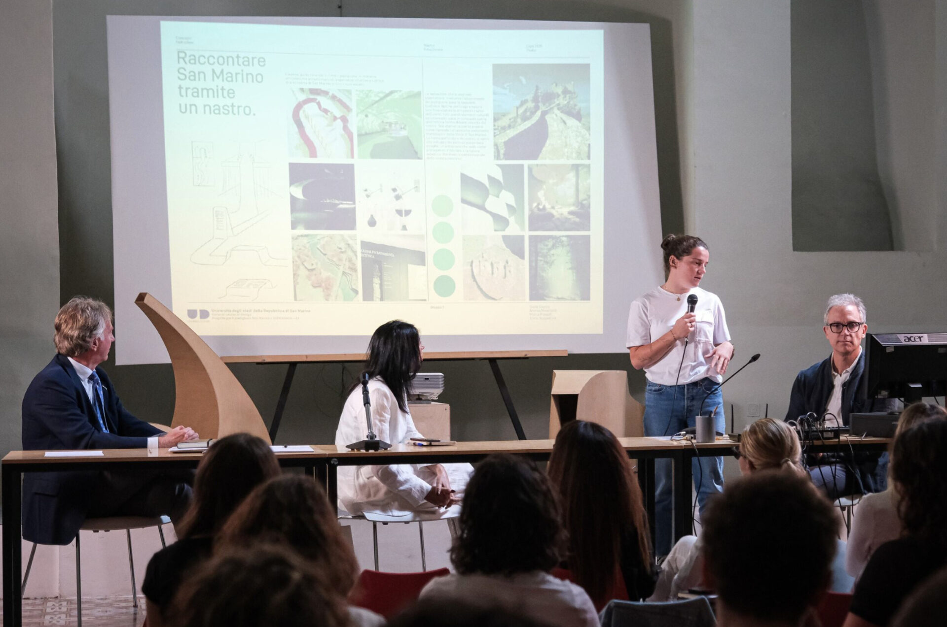 Sulla destra spazio invece a una serie di proiezioni che mostreranno alcuni aspetti e scorci della repubblica, per completare un percorso che assume diversi significati. “Ci siamo fatti ispirare dalla morfologia del territorio, che è qualcosa di sempre mutevole così come lo sono le modalità con cui la società di San Marino si gestisce. È sempre in evoluzione, attenta al cambiamento. Abbiamo voluto sottolineare questo parallelismo utilizzandolo come base per il concept proposto”.