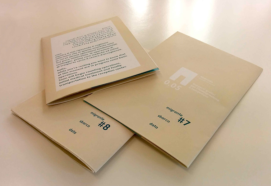 “0.05” è volto a supportare le operazioni che vengono attuate in materia d’immigrazione all’interno del Modello Lampedusa. Si tratteranno vari media: da segnaletiche stradali alle insegne e i supporti cartacei che potranno affiancare i vari operatori nello svolgimento delle proprie mansioni. Si sono creati media per le fasi di avvistamento, approdo e accoglienza. Dopo un attento studio si è arrivati a definire un possibile punto d’incontro culturale nella progettazione di segnaletiche e documentazioni. Per le tre fasi elencate sono state individuate i punti deboli che necessitavano di supporto per sveltire o rendere più umane alcune condizioni e operazioni, cercando di allontanarsi dal sistema su cui ora il Modello Lampedusa fa perno.