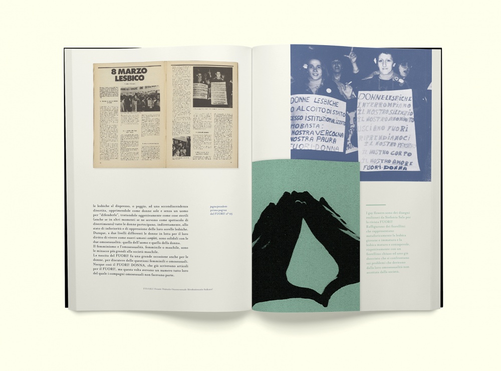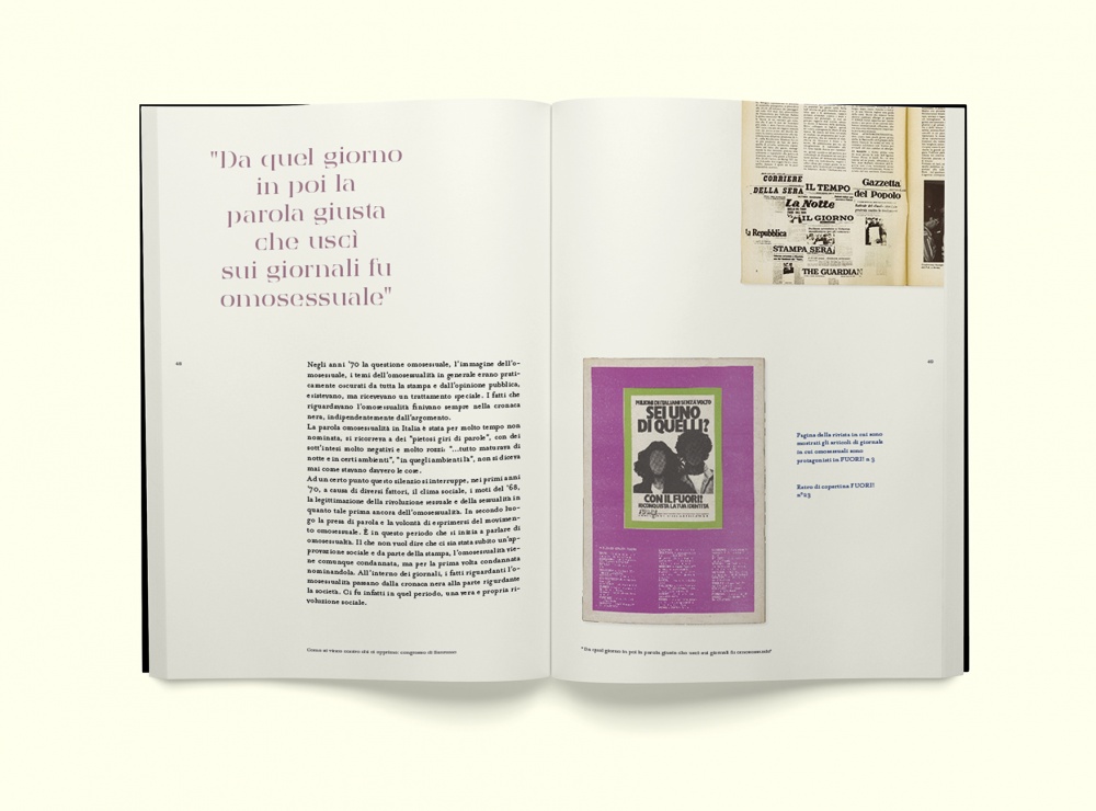 La proposta di ricerca riguarda un progetto editoriale sul FUORI! (Fronte Unitario Omosessuale Rivoluzionario Italiano!), il primo movimento italiano per la rivendicazione dei diritti degli omosessuali, attivo negli anni Settanta. La storia del movimento è stata ricostruita attraverso lo sfoglio della rivista, di cui furono pubblicati 32 numeri dal 1972 al 1982 e che è stata lo strumento principale per la propaganda dei diritti degli omosessuali. La quantità di informazioni, fotografie, illustrazioni reperite, anche grazie all’aiuto dei due fondatori di FUORI!, Angelo Pezzana ed Enzo Cucco, ha spinto gli autori a incentrare il progetto sulla ricostruzione del movimento. Ne è scaturito un lavoro che racconta la storia di FUORI! da più punti di vista, mettendo in mostra le storie, le rivolte, gli aneddoti e fornendo così al lettore una visione completa della vicenda.
