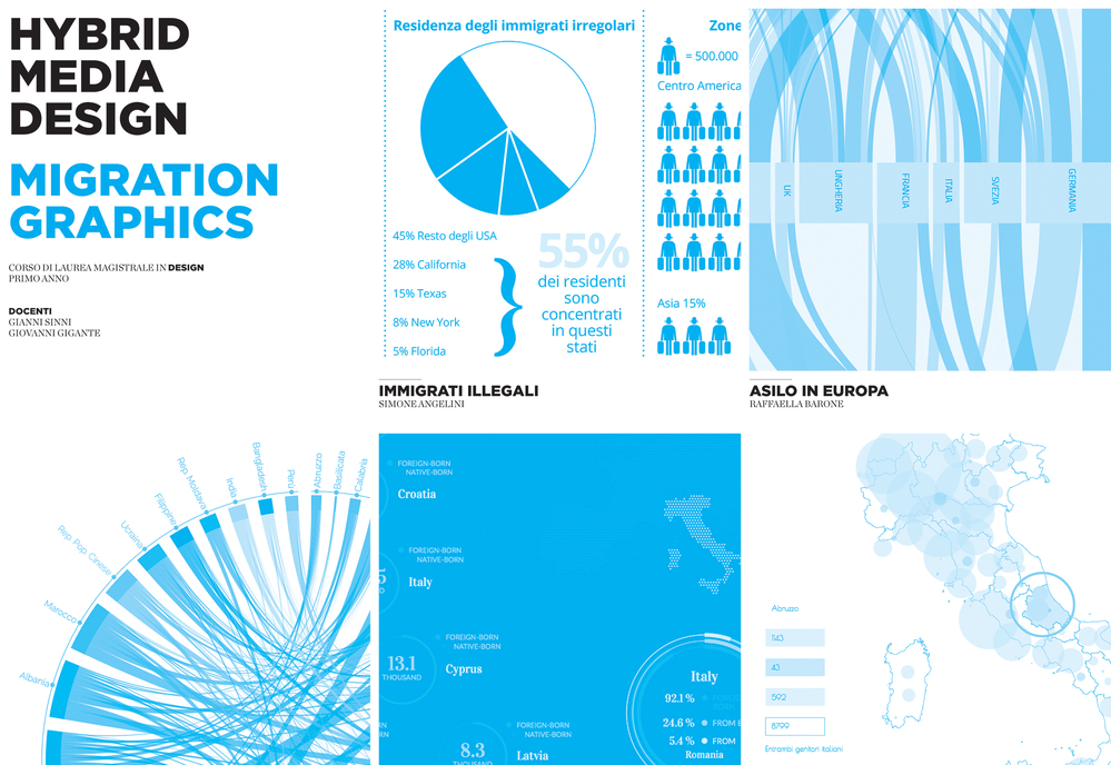 Il corso di Hybrid design del Corso di laurea magistrale in design, tenuto da Gianni Sinni con Giovanni Gigante, si è sviluppato in un percorso che, partendo dalle conoscenze pregresse degli studenti relative al design visivo e all’interazione, portasse a confrontarsi con un progetto complesso come quello della visualizzazione dei dati sul tema “Migration Graphics”.