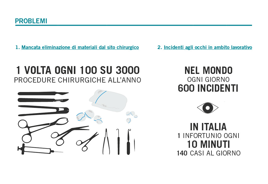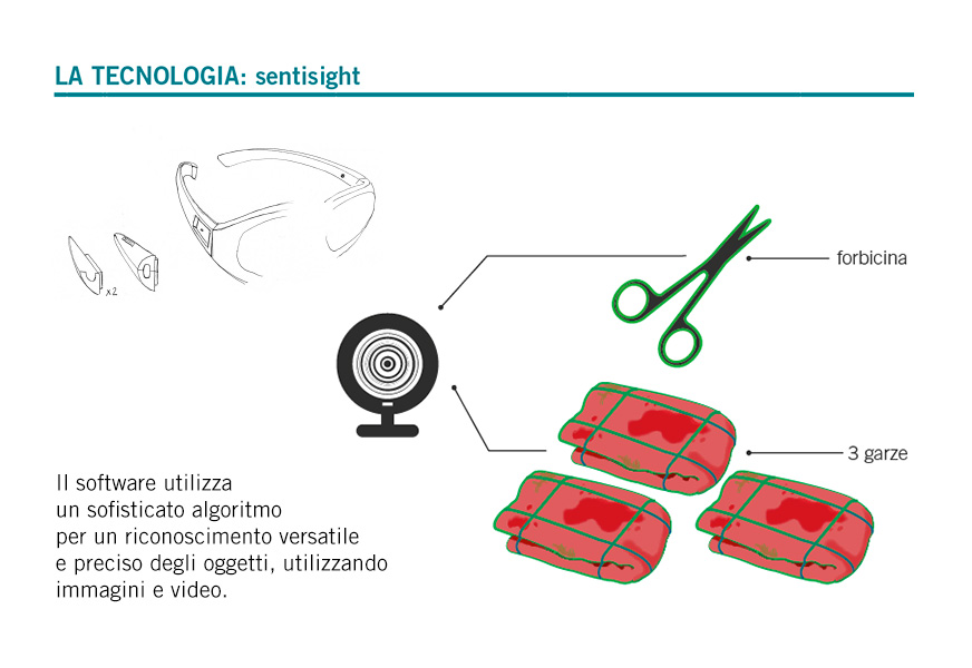 I “Safeyes” sono un dispositivo di protezione individuale oculare, DPI, pensati esclusivamente per il loro utilizzo in campo medicale. Oltre a svolgere la funzione di proteggere gli occhi dell’operatore da agenti chimici, fisici e biologici, i “Safeyes” sono in grado di prevenire le mancate eliminazioni di strumenti o materiali all’interno del sito chirurgico grazie a una micro telecamera che, collegata al pc durante gli ultimi 15 minuti di intervento, invia immagini video al software Sentisight che è in grado di riconoscere materiali e strumenti precedentemente appresi e catalogati. Questa funzione aiuta il chirurgo a ritrovare tutto ciò che ha utilizzato durante l’intervento, evitando così di prolugare i tempi in sala operatoria , di estendere l’anestesia al paziente e di dover ricorrere all’intervento del radiologo.