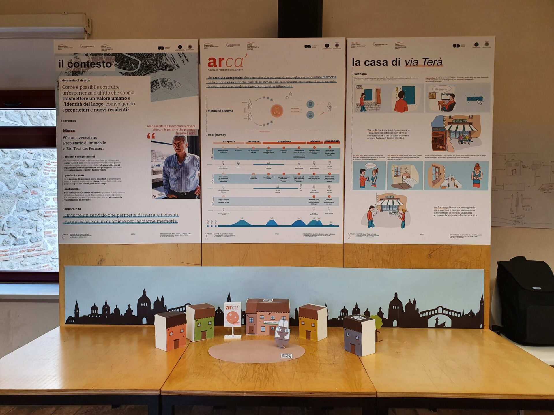 Arcà, un archivio digitale autogestito che permette a ciascun residente delle abitazioni di Rio Terà di costruire una memoria privata della propria casa, e collettiva del quartiere. L’archivio è una raccolta di tracce caricate dai residenti (testi, foto, video e suoni) che documentano la vita lungo il Rio e la fanno diventare patrimonio comune. La memoria si costruisce di elementi storici, come vecchie fotografie delle facciate della abitazioni o delle attività di un tempo, e elementi registrati oggi, come il suono del mercato o un dialogo tra veneziani, e diventa accessibile ai passanti in una sorta di mostra a cielo aperto.